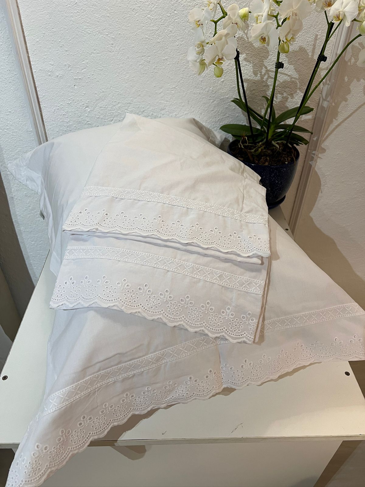 Capa em percal 230 fios, 100% algodão, com aplicação delicada de laise nas abas. O modelo totalmente branco traduz elegância atemporal e leveza, com toque macio e acabamento refinado digno de hotel boutique.