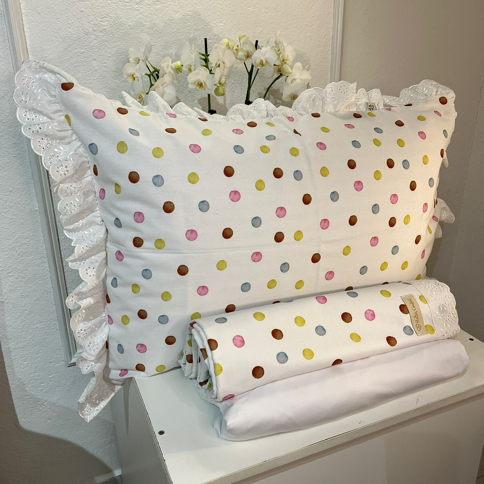 Branco com poás coloridos e detalhe de laise branca na fronha.