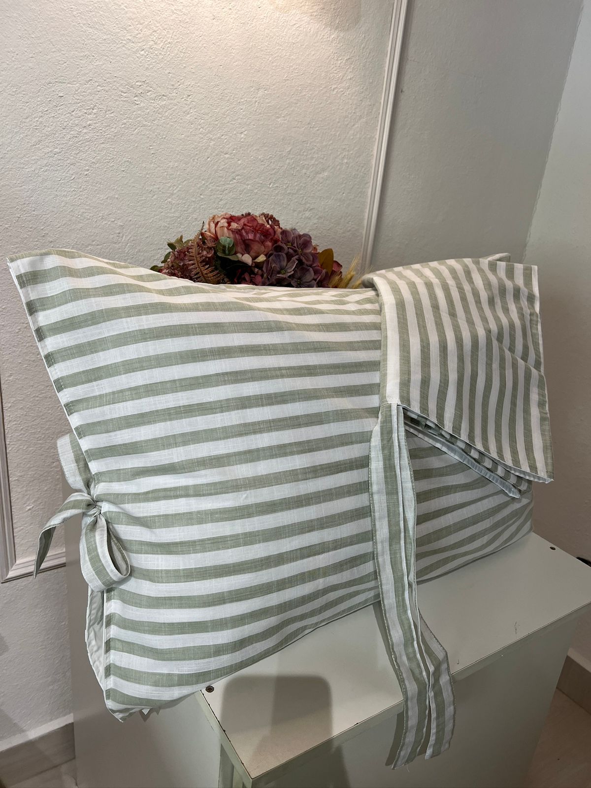 Capa confeccionada em 100% algodão de alta qualidade, com estampa listrada em verde e branco que remete à leveza e frescor da estação. O laço frontal adiciona um toque artesanal e delicado, valorizando o cuidado em cada detalhe e trazendo sofisticação para o ambiente.