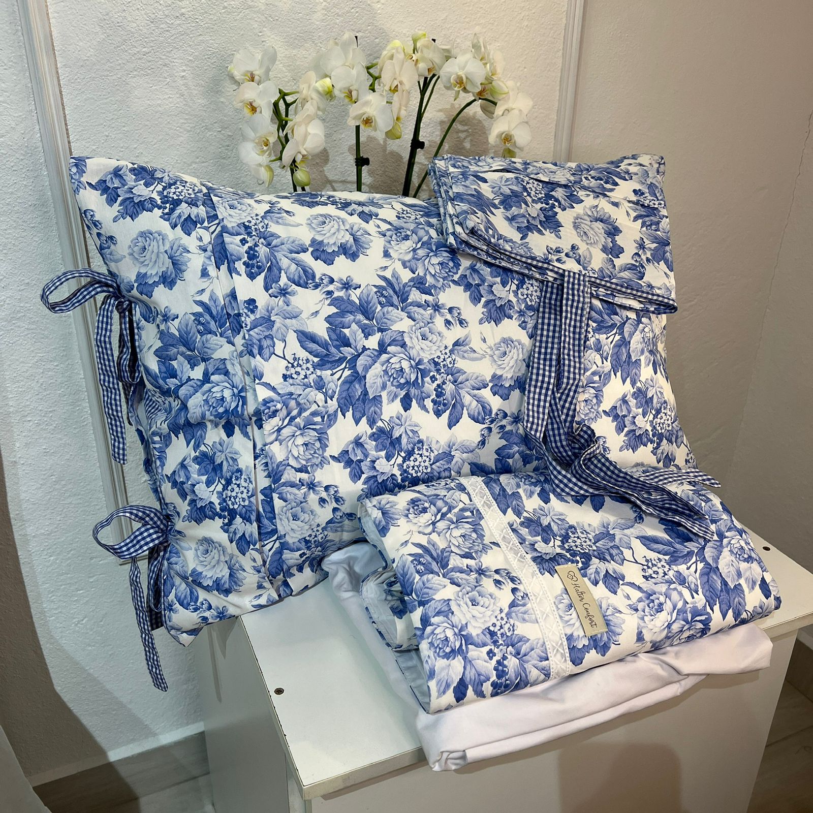 Jogo de lençol 100% algodão, percal 230 fios, composto por 4 peças: lençol com elástico, lençol plano com virol e 2 capas de travesseiro. A estampa floral azul e branca com laços xadrez une romantismo e elegância, trazendo leveza e frescor à decoração.