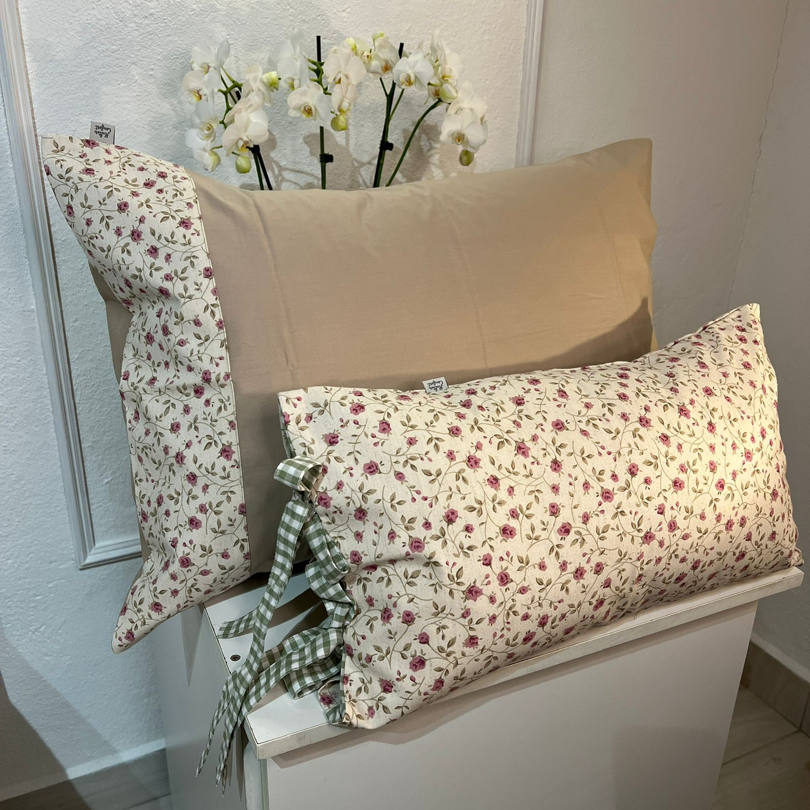 Use ao centro da cama com capas lisas ou florais coordenadas; fica lindo com tricots claros e mantas leves.